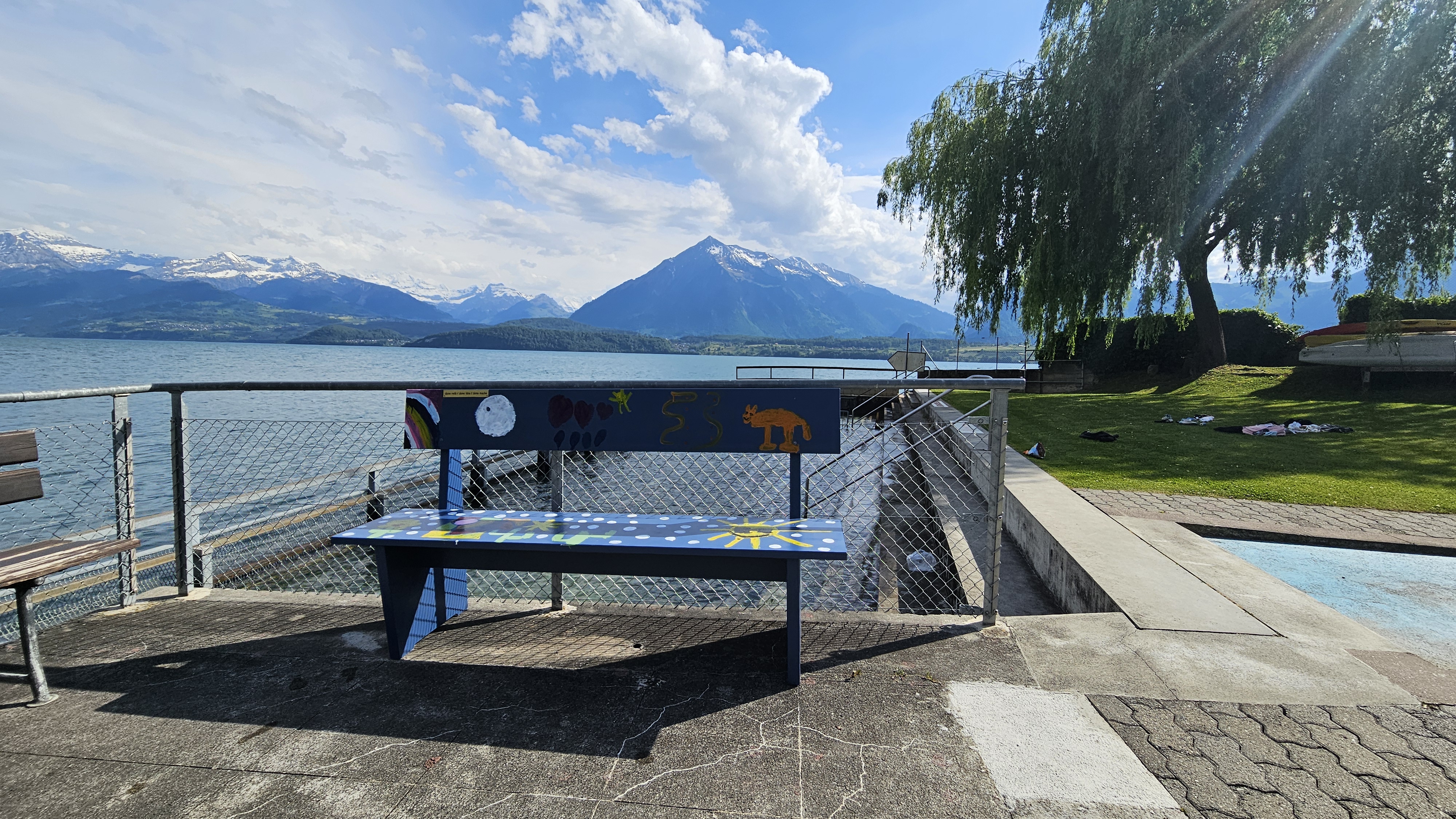 Die von den Kindern der Dorfschule in Hilterfingen bemalte Bank soll das generationenübergreifendes Miteinander symbolisieren und als Ort zum Reden, Zuhören, Kennenlernen und Entspannen dienen.